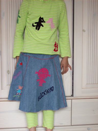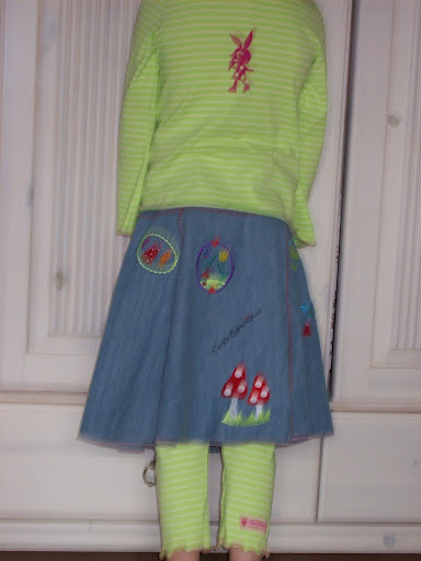 Hier noch das Room Seven Blüschen...nach einer ganz tollen spontanen Tauschaktion mit einer anderen tollen Näherin brauchten wir ein Kombiteil...auf dem getauschten Jeansrock befindet sich ein Bambi aus genau dem Stoff appliziert...zusammen superniedlich und unsere zweite Lieblingskombi...nun darf das Hollandkleid auch wieder in Ruhe trocknen ;o)))